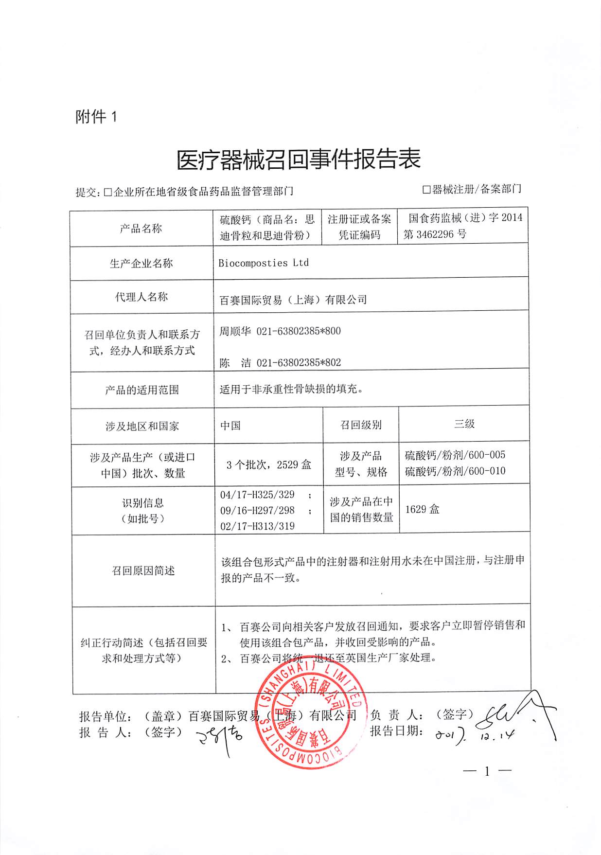 百赛国际贸易(上海)有限公司报告,涉及产品组合包形式产品中的注射器和注射用水未在中国注册,与注册申报的产品不一致。百赛国际贸易(上海)有限公司对硫酸钙(注册证号:国食药监械(进)字2014第3462296号)主动召回。召回级别为三级。涉及产品的型号、规格及批次等详细信息见《医疗器械召回事件报告表》。(来源:CFDA)